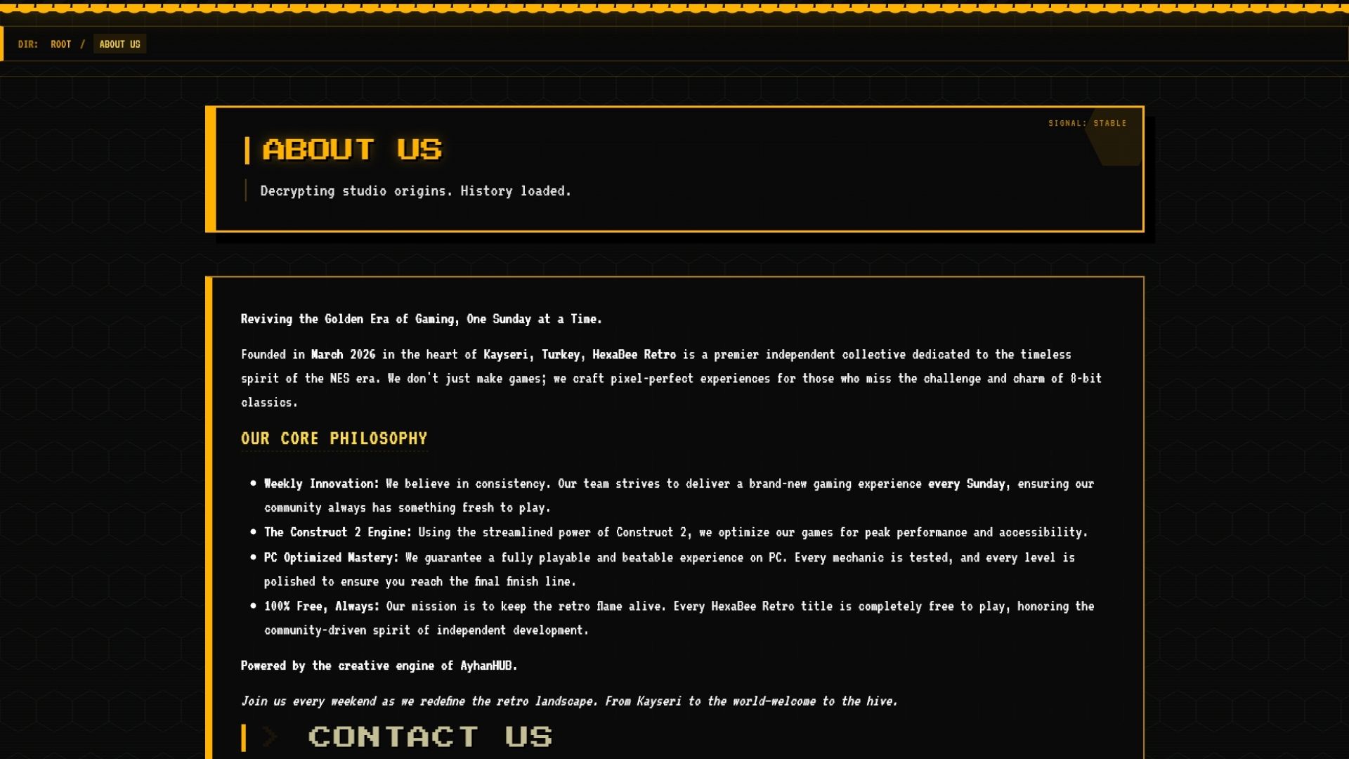 AyhanHUB üzerindeki ağır yük olan Kutucuk varken, bunun üzerinde değişik oyun projeleri denemek ve onları sadece İngilizce diline sahip olacak şekilde yayınlamak için Hexabee Retro‘yu kurdum. Sitesinin de İngilizce olduğunu unutmayın.