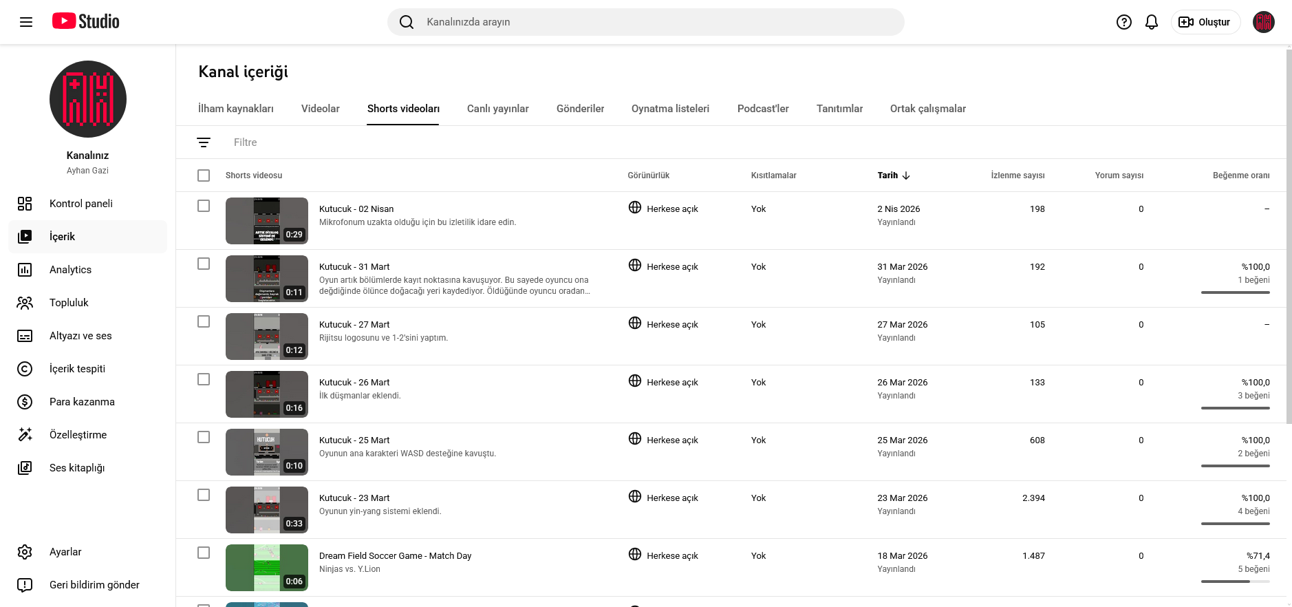 Youtube kanalımdaki kısa izletiler yani short video içeriklerim açıkçası beni tatmin ediyor, genelde. Bir içeriği zamanlı atmaya başladığımdan beri izlenmeler dalgalansa bile, minimum 100 kez izleniyor. Tabii benim beklentim 300’dür, yine de 100’e bile razıyım. Yeter ki izlensinler, beğenilmesi ve yorumlanması umurumda bile değil.